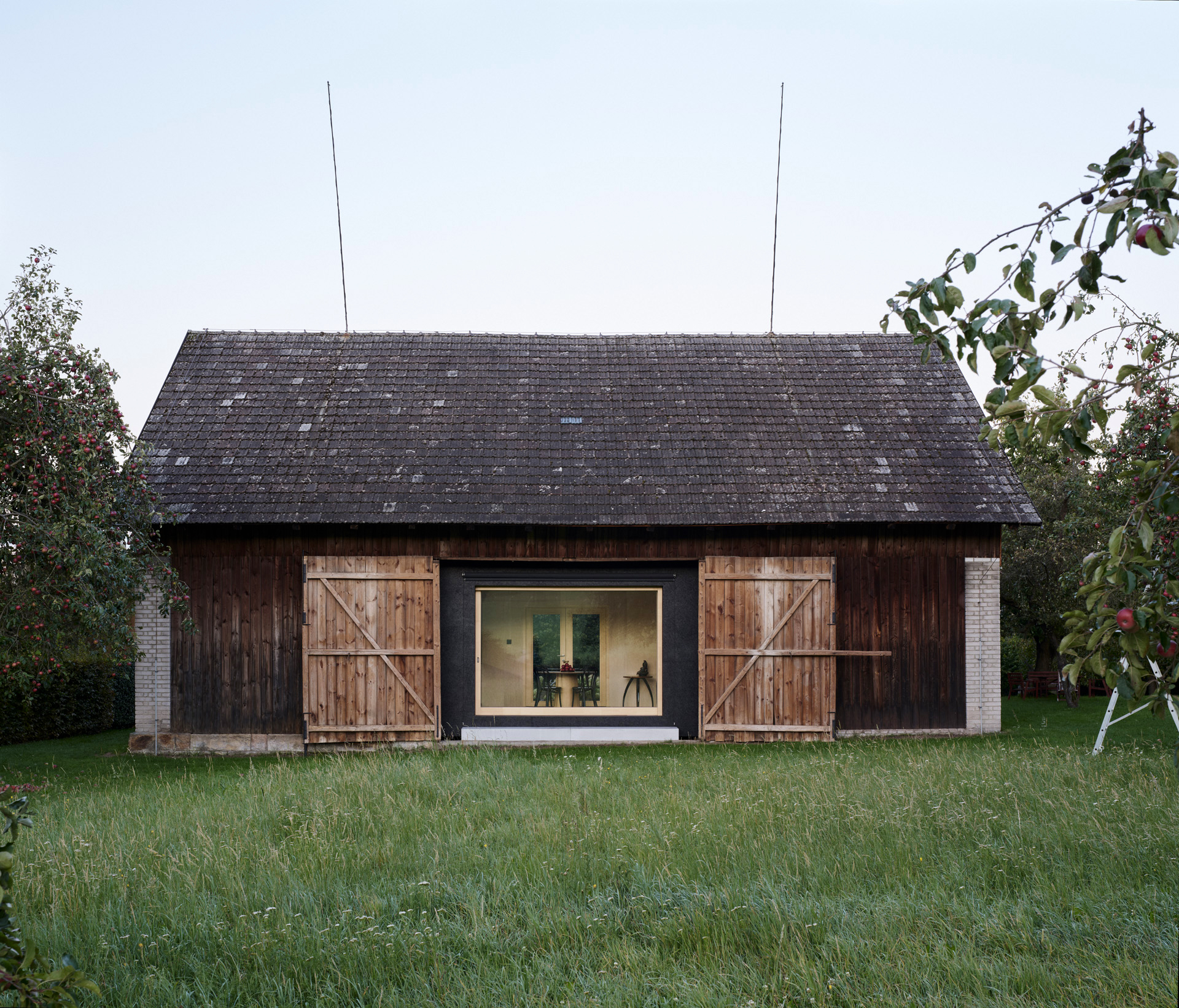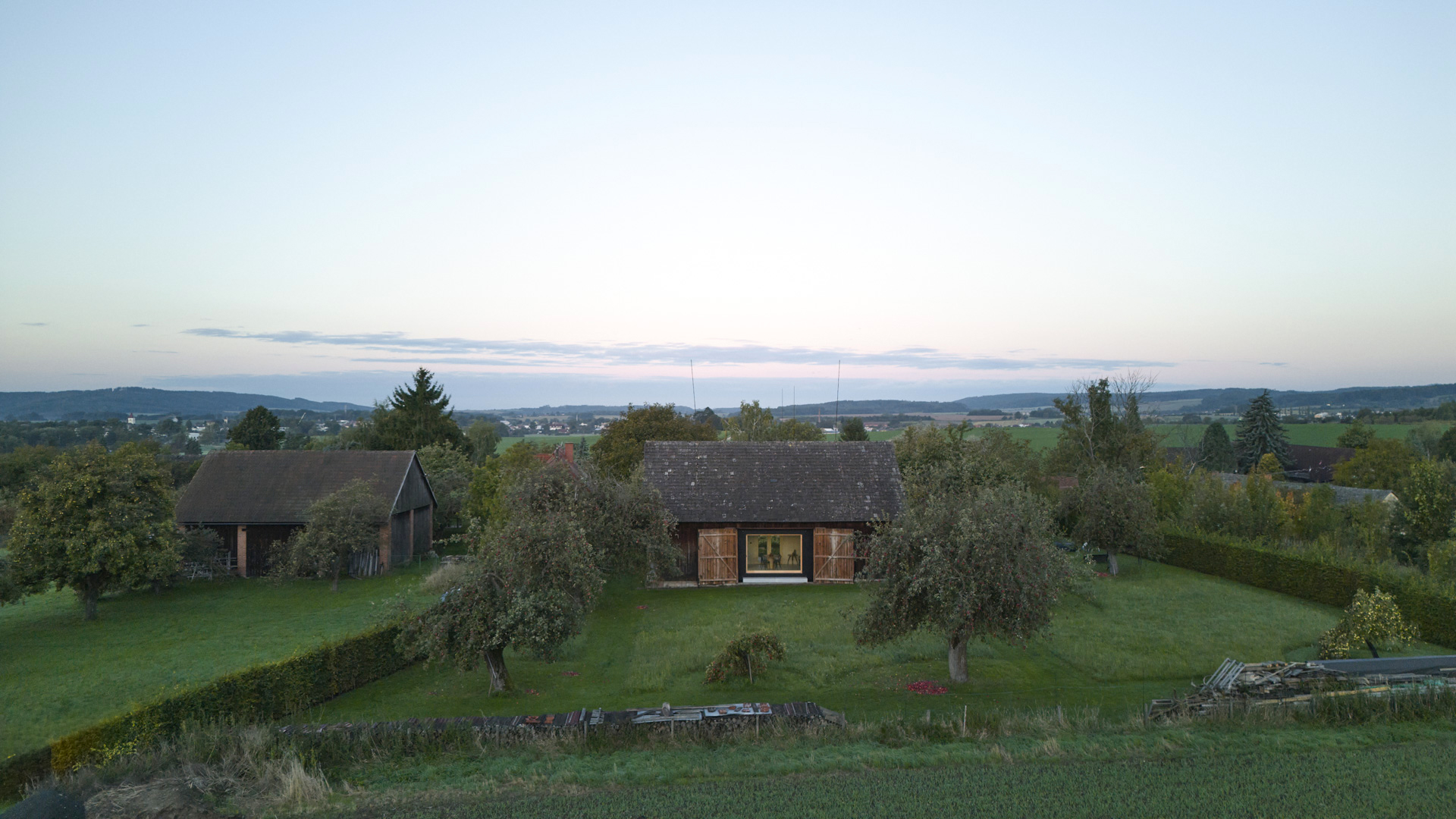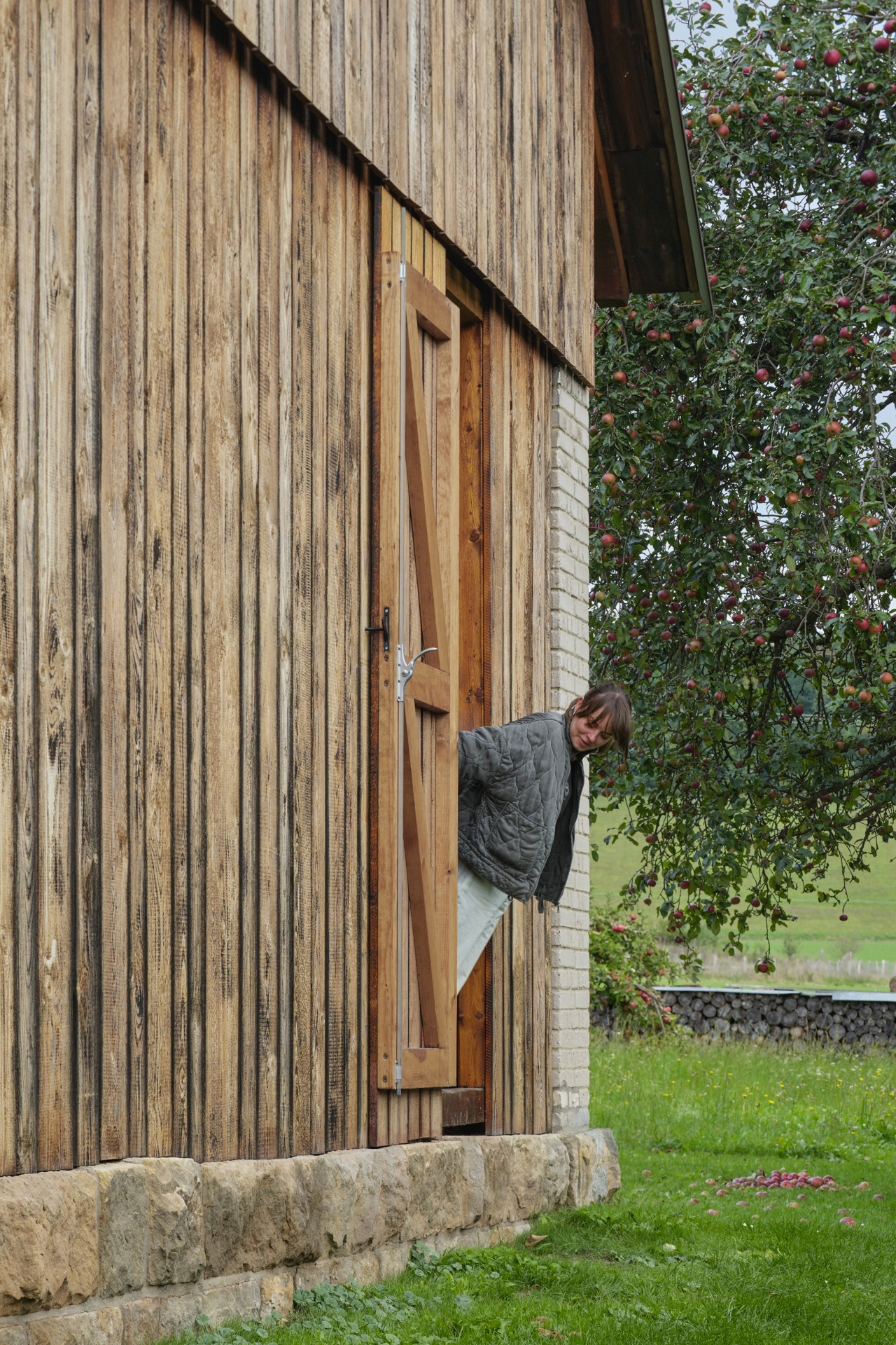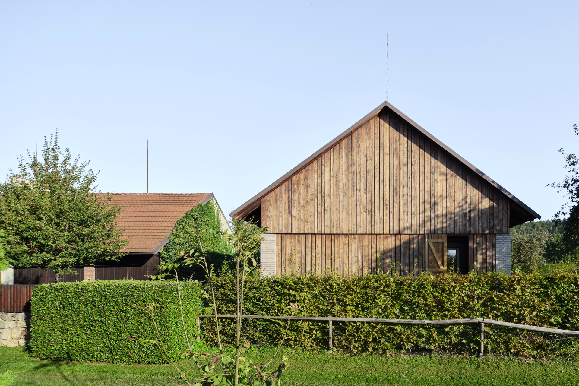 Navrhli jsme malou jednotku pro sezonní pobyt vestavěnou do stodoly u venkovské usedlosti. Volně vložená dřevostavba ve formě kvádru je zabalena do černé asfaltové obálky. Samotná stodola si zachovává původní podobu a se zavřenými vraty a bočními okenicemi nic nenasvědčuje tomu, že se uvnitř nachází nový objekt. Jen do dvora přesahuje betonový koberec, který se po otevření vrat dál rozprostírá přes prázdnou polovinu stodoly až k monolitickým stupním před vstupem. Do lapidárního interiéru vyloženého březovou překližkou je vsazen blok kuchyně s vestavěným nábytkem a koupelnou, který odděluje hlavní prostor od spací kóje. Po otevření vrat se před velkým posuvným oknem rozlévá zahrada se starými jabloněmi.