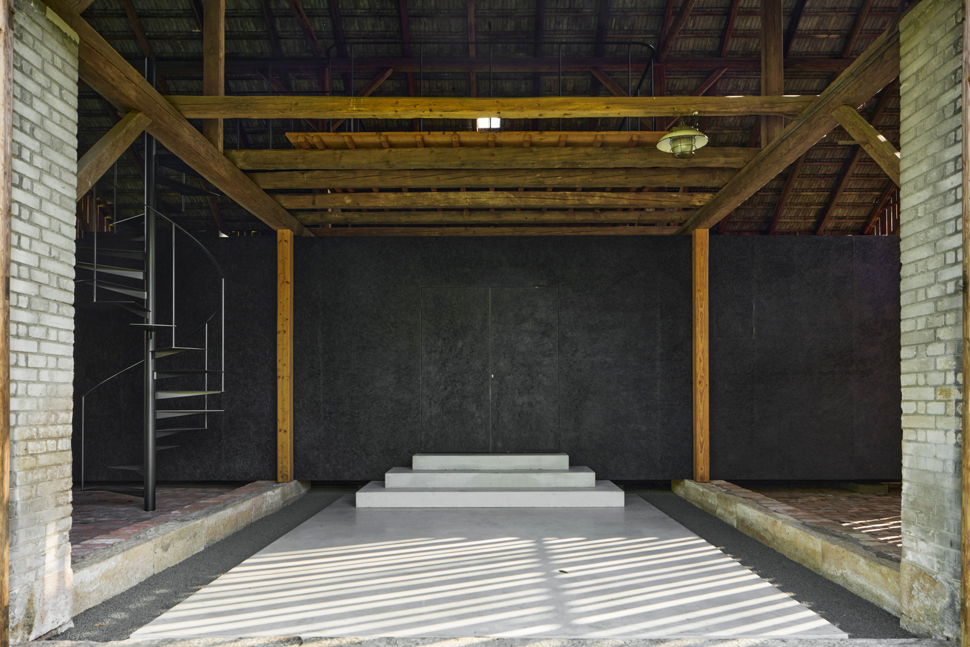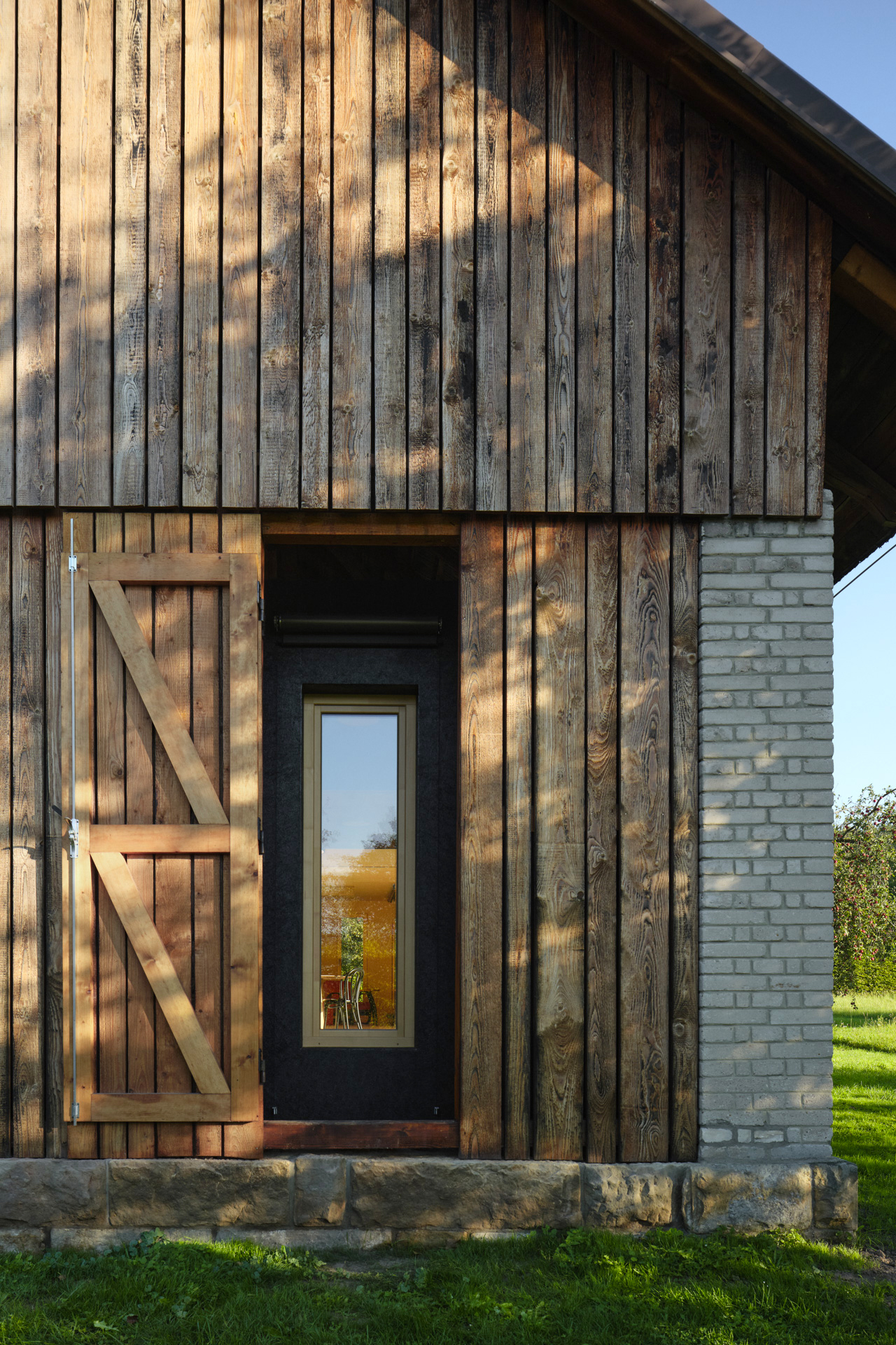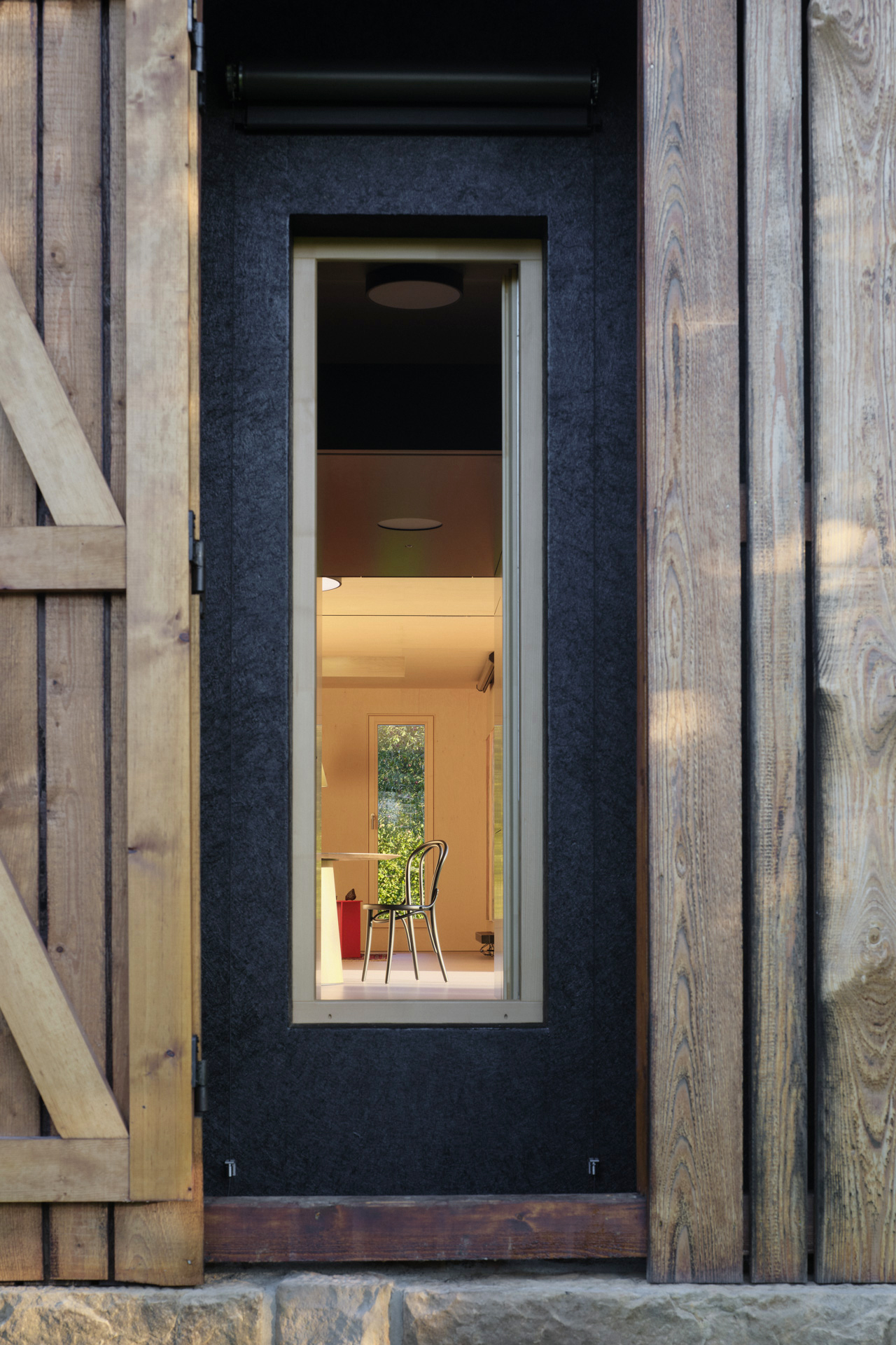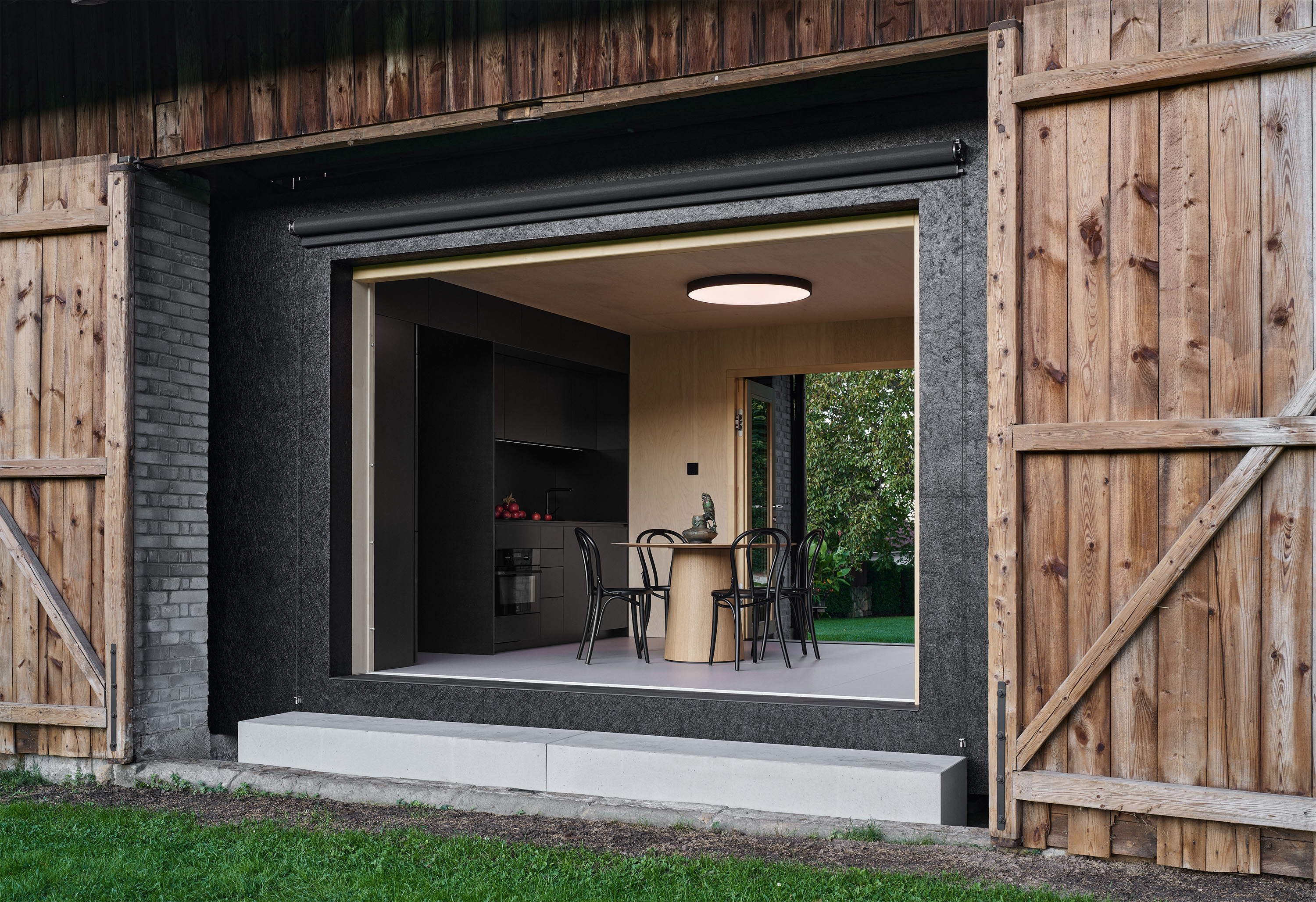 Navrhli jsme malou jednotku pro sezonní pobyt vestavěnou do stodoly u venkovské usedlosti. Volně vložená dřevostavba ve formě kvádru je zabalena do černé asfaltové obálky. Samotná stodola si zachovává původní podobu a se zavřenými vraty a bočními okenicemi nic nenasvědčuje tomu, že se uvnitř nachází nový objekt. Jen do dvora přesahuje betonový koberec, který se po otevření vrat dál rozprostírá přes prázdnou polovinu stodoly až k monolitickým stupním před vstupem. Do lapidárního interiéru vyloženého březovou překližkou je vsazen blok kuchyně s vestavěným nábytkem a koupelnou, který odděluje hlavní prostor od spací kóje. Po otevření vrat se před velkým posuvným oknem rozlévá zahrada se starými jabloněmi.