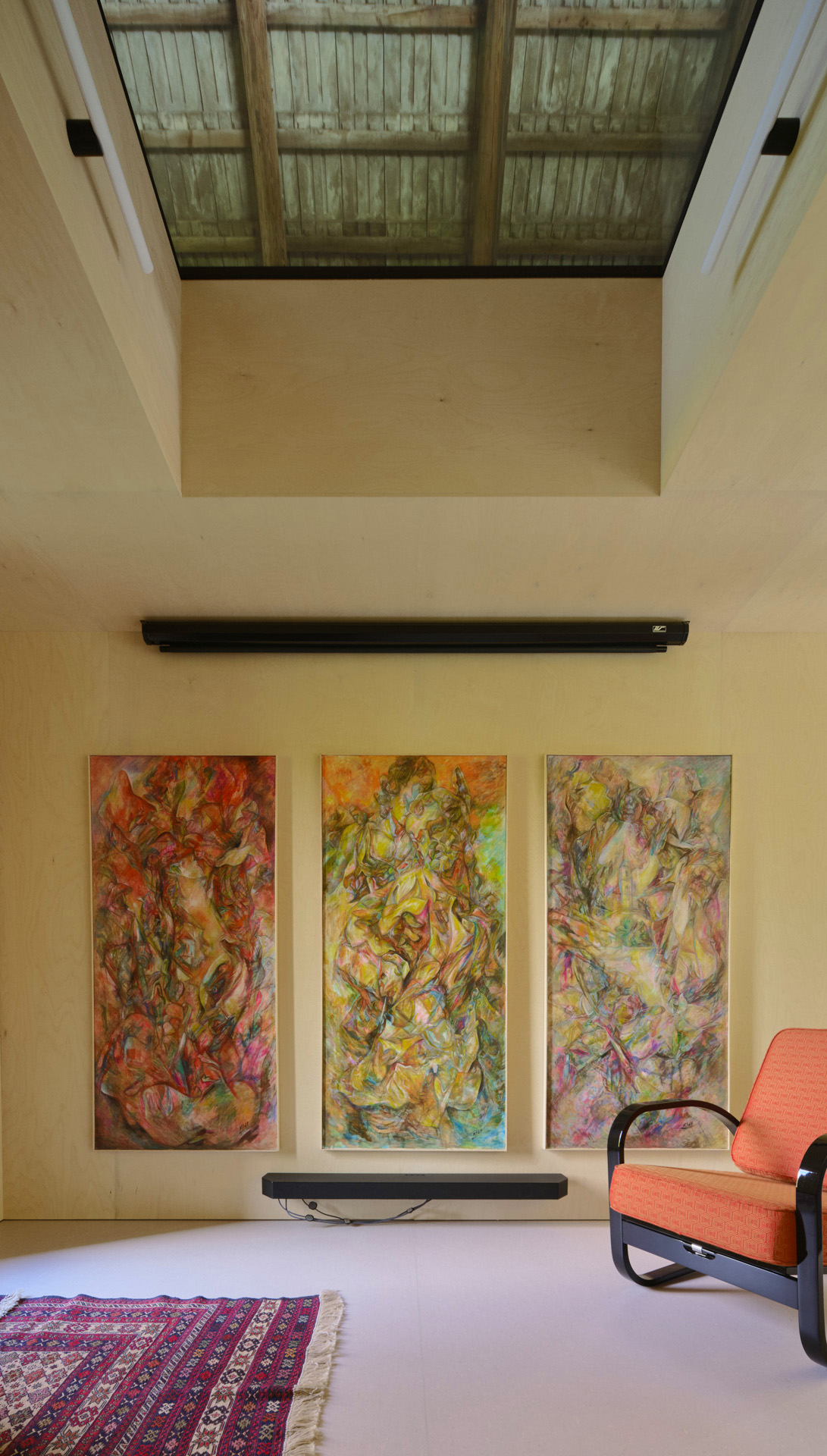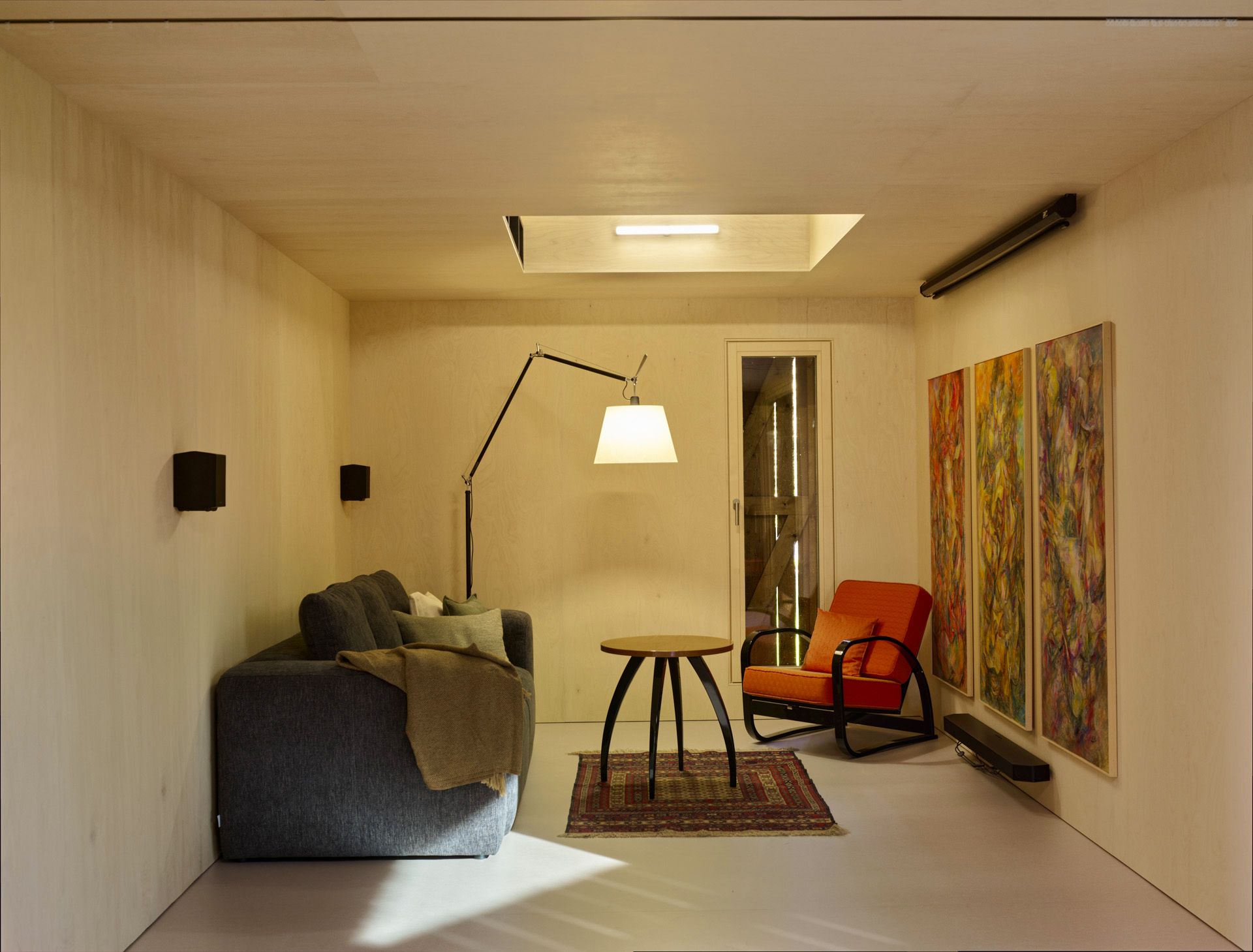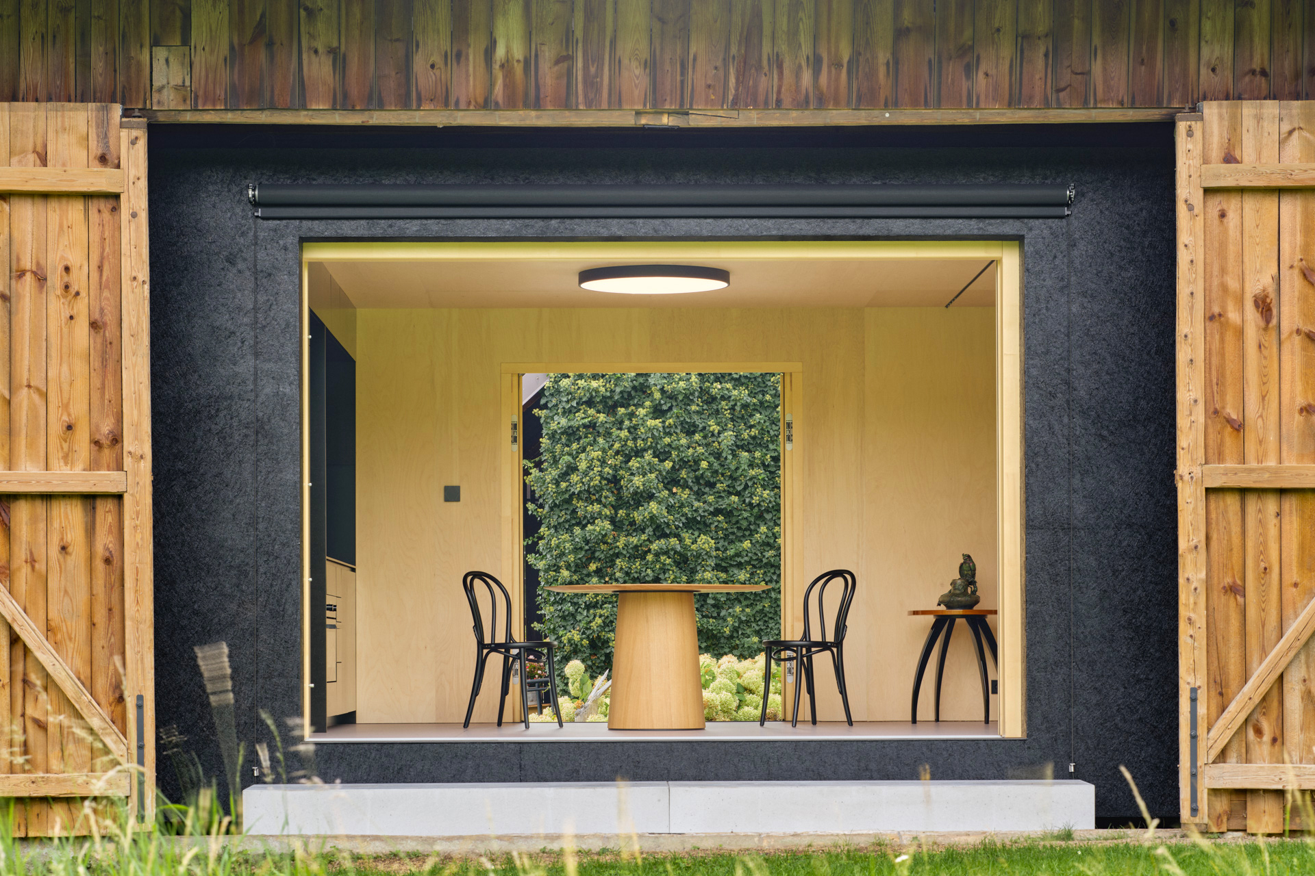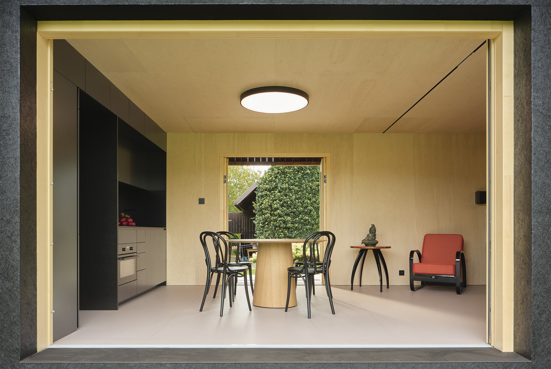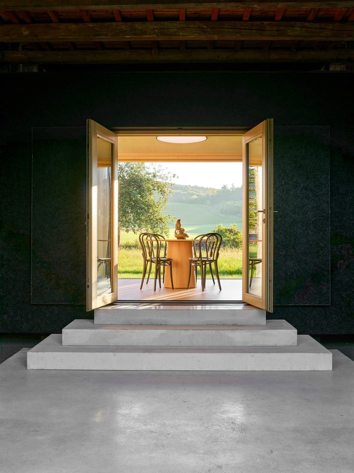 Navrhli jsme malou jednotku pro sezonní pobyt vestavěnou do stodoly u venkovské usedlosti. Volně vložená dřevostavba ve formě kvádru je zabalena do černé asfaltové obálky. Samotná stodola si zachovává původní podobu a se zavřenými vraty a bočními okenicemi nic nenasvědčuje tomu, že se uvnitř nachází nový objekt. Jen do dvora přesahuje betonový koberec, který se po otevření vrat dál rozprostírá přes prázdnou polovinu stodoly až k monolitickým stupním před vstupem. Do lapidárního interiéru vyloženého březovou překližkou je vsazen blok kuchyně s vestavěným nábytkem a koupelnou, který odděluje hlavní prostor od spací kóje. Po otevření vrat se před velkým posuvným oknem rozlévá zahrada se starými jabloněmi.