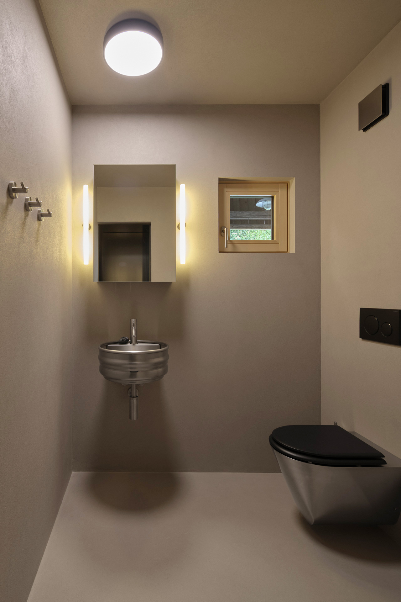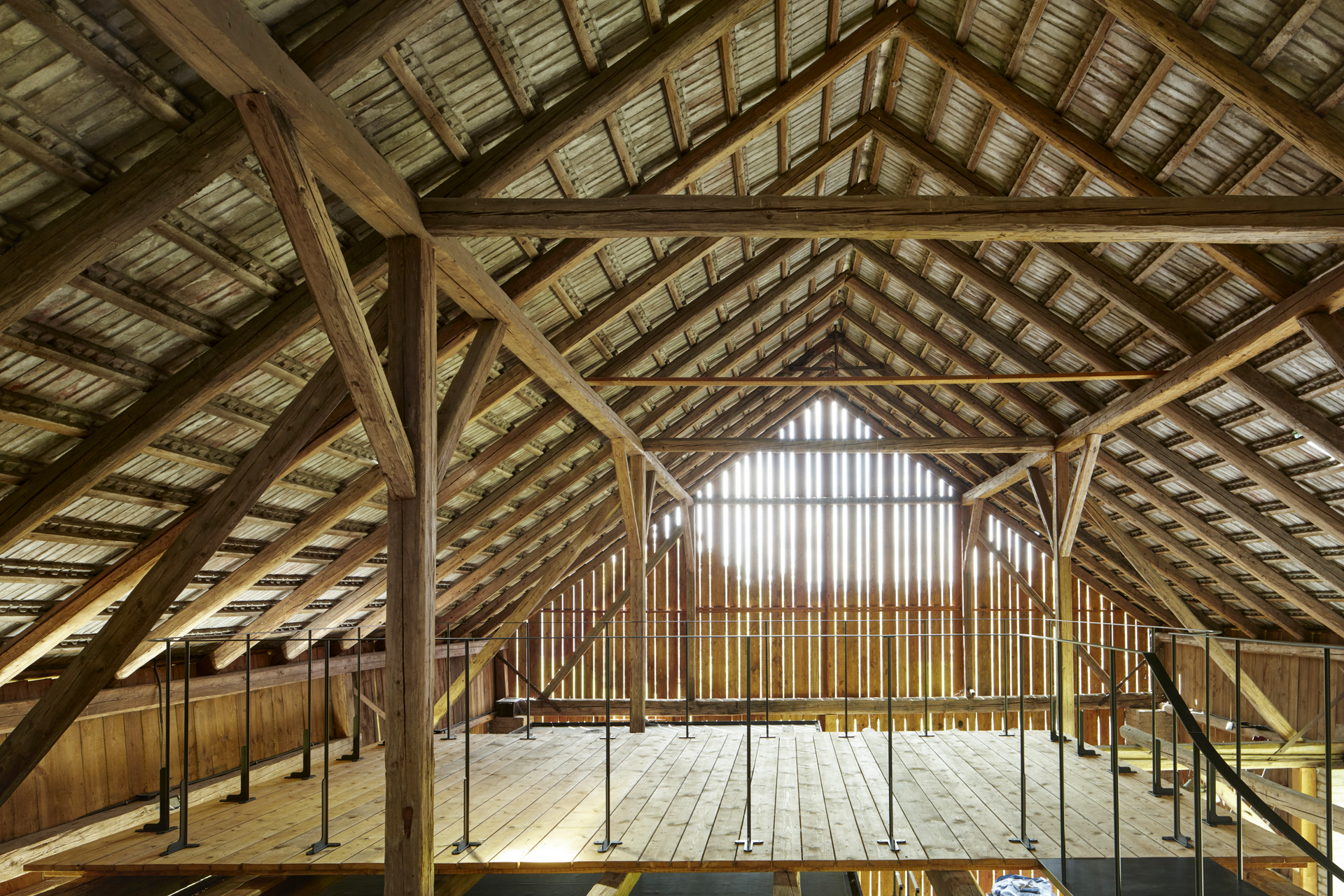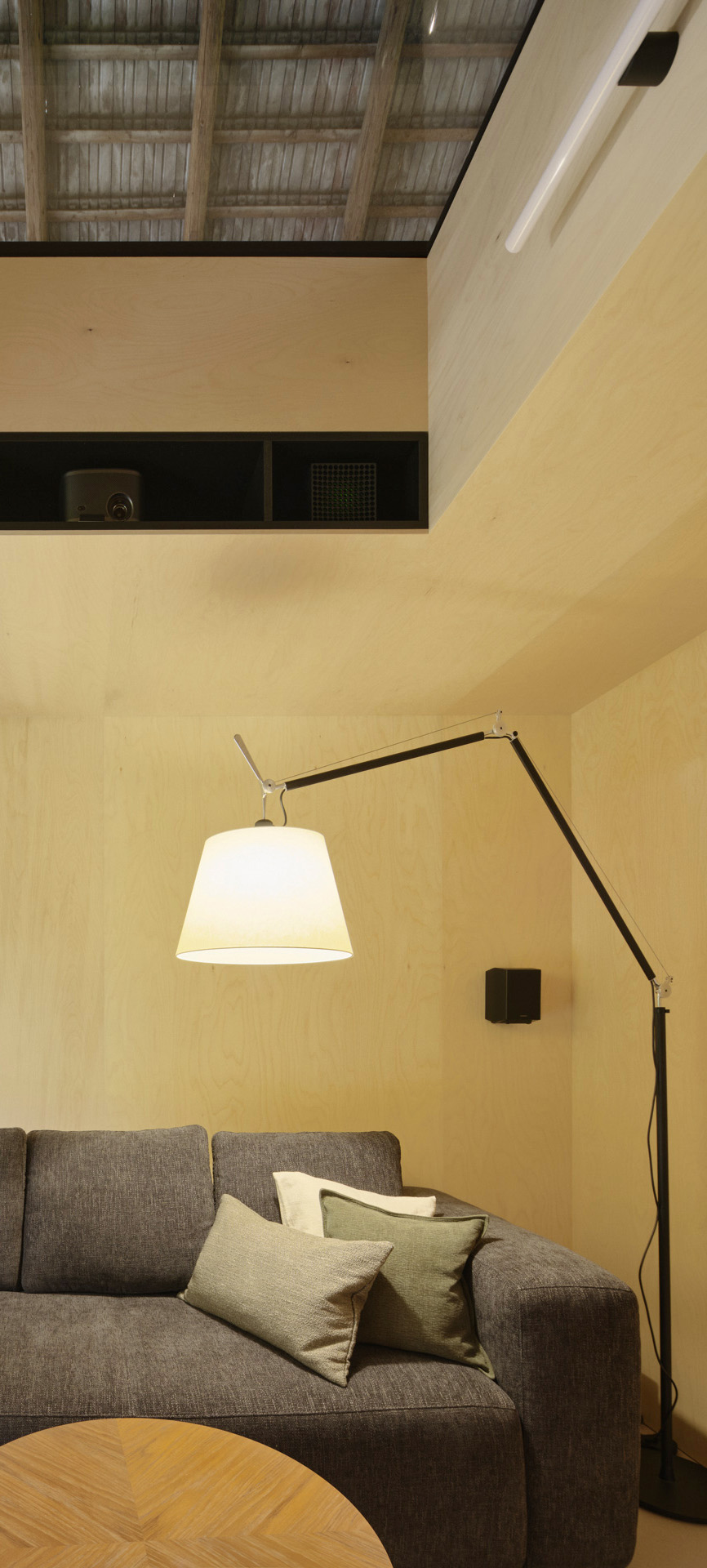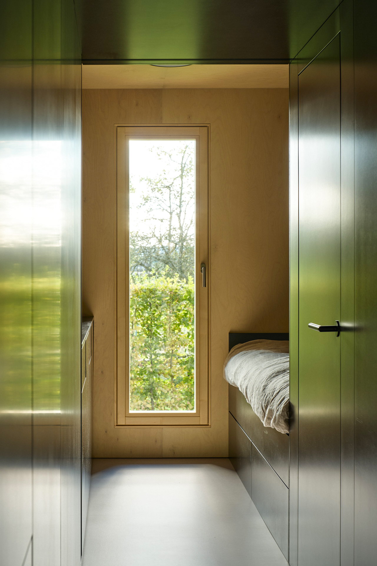 Navrhli jsme malou jednotku pro sezonní pobyt vestavěnou do stodoly u venkovské usedlosti. Volně vložená dřevostavba ve formě kvádru je zabalena do černé asfaltové obálky. Samotná stodola si zachovává původní podobu a se zavřenými vraty a bočními okenicemi nic nenasvědčuje tomu, že se uvnitř nachází nový objekt. Jen do dvora přesahuje betonový koberec, který se po otevření vrat dál rozprostírá přes prázdnou polovinu stodoly až k monolitickým stupním před vstupem. Do lapidárního interiéru vyloženého březovou překližkou je vsazen blok kuchyně s vestavěným nábytkem a koupelnou, který odděluje hlavní prostor od spací kóje. Po otevření vrat se před velkým posuvným oknem rozlévá zahrada se starými jabloněmi.