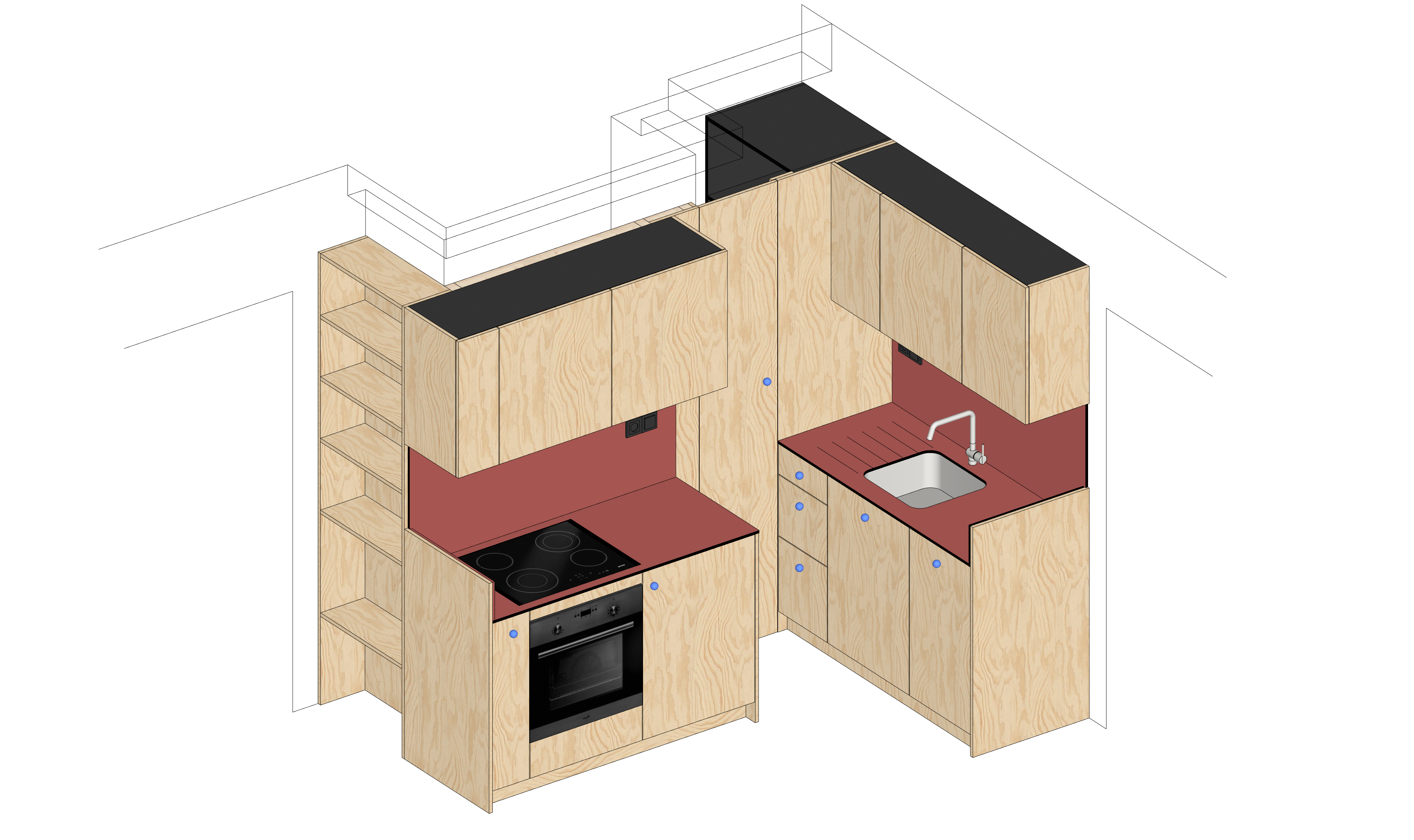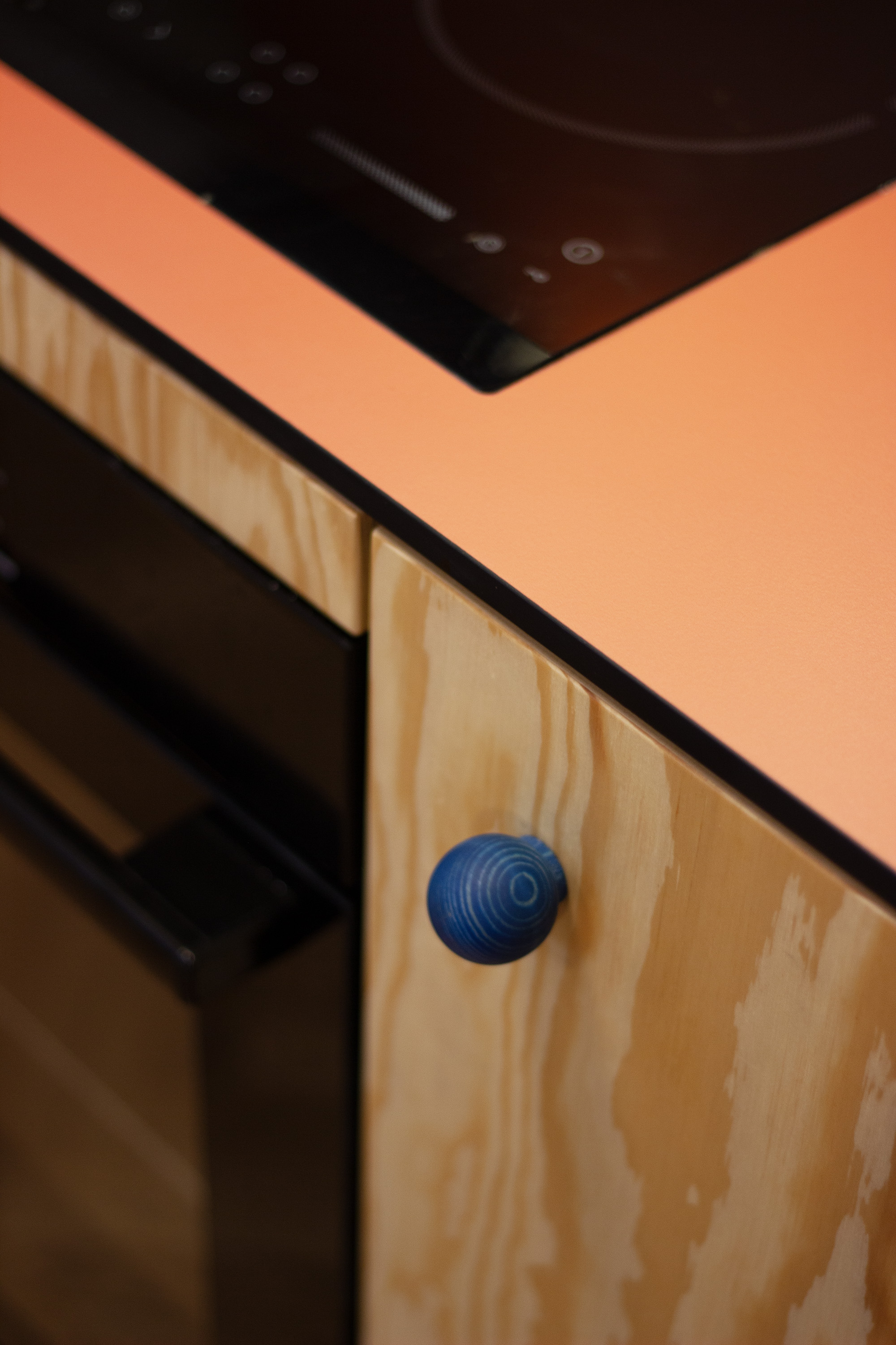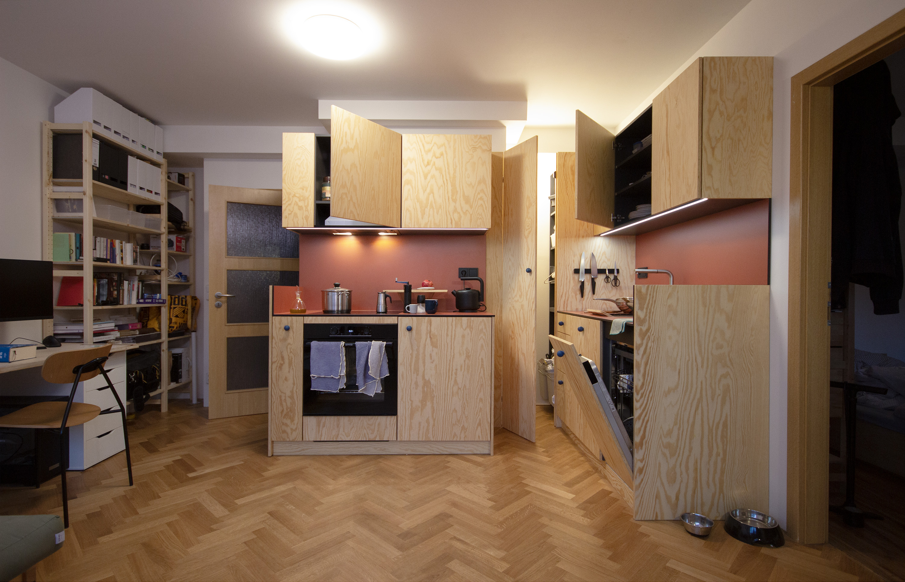 Na omezený a atypicky členěný prostor reaguju rozdělením kuchyně do dvou samostatných pracovních ploch, v rohové nice vytvářím malou komoru, která na bytě zoufale chyběla. Borová překližka, kompaktní pracovní deska a modře mořené knopky.
